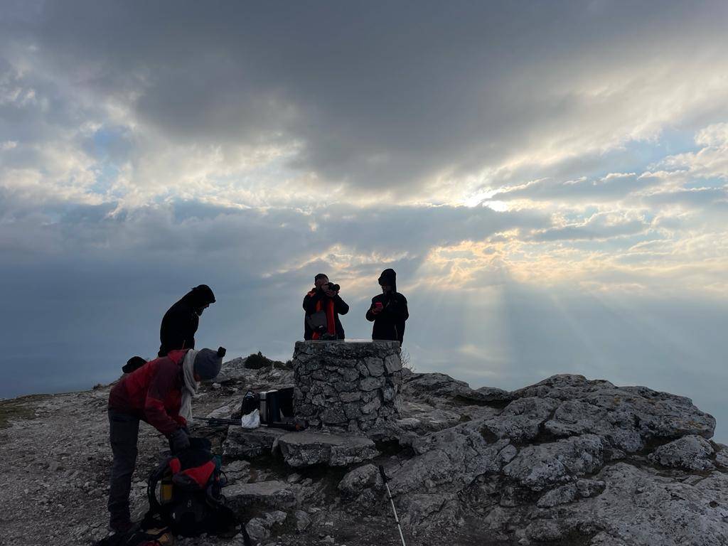 Départ de nuit à la lumière des frontales, montée en même temps que le lever du soleil, et arrivée au sommet les tous premiers !